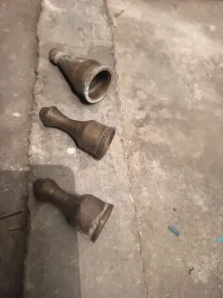 Conjunto de tres boquillas para manguera, fabricadas en metal con un acabado envejecido. - Material: Metal. - Cantidad: 3 unidades. - Diseño cónico y cilíndrico.