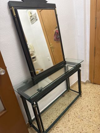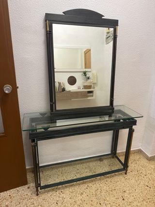 Elegante mueble de recibidor con estructura de forja y detalles en metal, coronado por un espejo. - Tablero superior de cristal. - Estante inferior de cristal. - Diseño con líneas rectas y acabados cuidados.