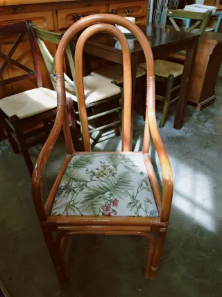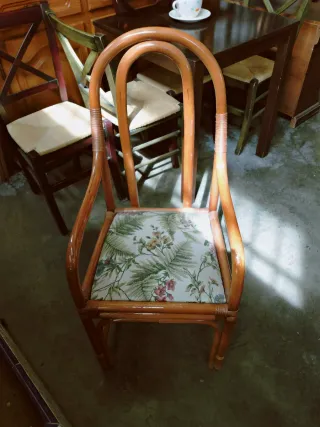 silla de bambú natural con un diseño floral. - Estructura de bambú - Cojin con estampado de flores.