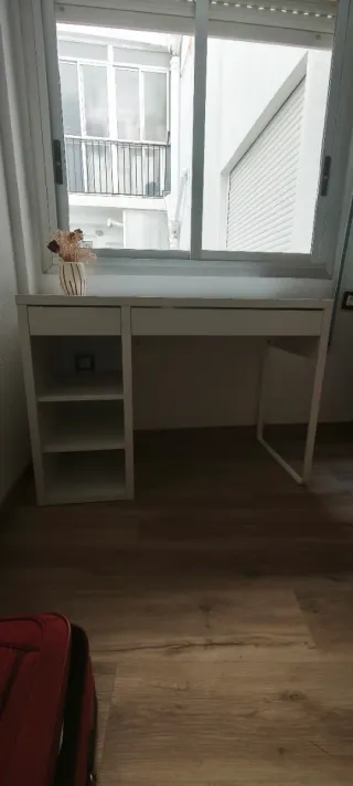 Escritorio moderno de Ikea con medidas 50cm ancho, 105cm de largo y 75cm de alto. - Cuenta con dos cajones. - Incluye estanterías laterales para almacenamiento. - Agujero para cables del ordenador. Está en Llíria, hay que ir a recogerlo.