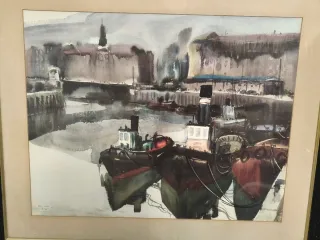 Acuarela firmada que representa un puerto con barcos. - Representación detallada de embarcaciones y arquitectura portuaria de Bilbao.