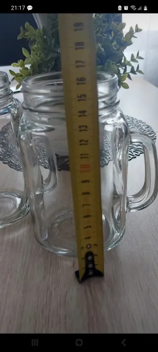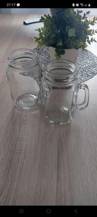 Set de dos tarros de cristal con asa, perfectos para bebidas o decoración. - Diseño tipo mason jar. - Asa para un agarre cómodo.