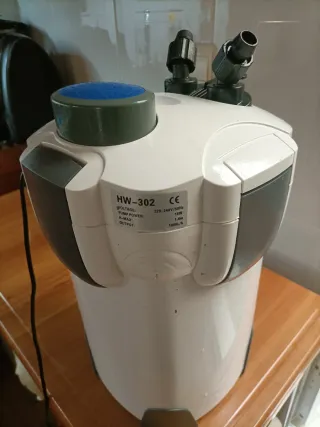 Filtro externo para acuarios SunSun HW-302. - Voltaje: 220-240V/50Hz - Potencia: 18W - Altura máxima: 1.4m - Caudal: 1000L/h - 6 meses de uso