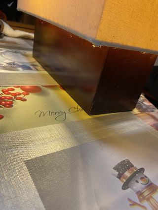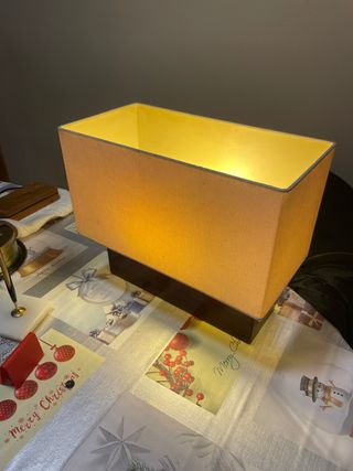 Elegante lámpara de sobremesa con un diseño moderno y funcional. Su pantalla rectangular proporciona una luz cálida y acogedora. Marca tarogo años, 80 - Pantalla de tela en color beige. - Base de madera en tono marrón oscuro. -medidas de la base 30cm × 10 cmla pantalla mide 34cm × 17cm la altura 28 cm