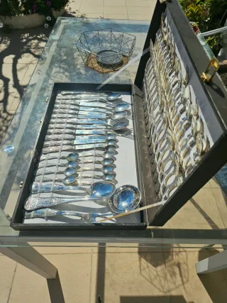 Elegante cubertería . Plata 800, Italiana , para ocasiones especiales o para añadir un toque de distinción a tu mesa. Algunas pocas piezas hay que sacarles el brillo con producto adecuado. - Diseño clásico y detallado. - Set de postre , cuchillos , cucharas , tenedores etc - Presentada en un estuche marron en perfectas condiciones.