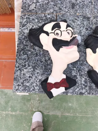 Conjunto de dos figuras decorativas para pared. - Diseño inspirado en personajes icónicos. - Acabado multicolor con detalles en negro.