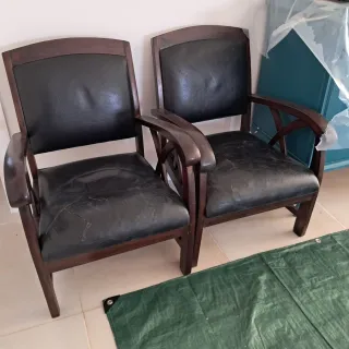 Conjunto de dos sillones con un diseño clásico y elegante. - Tapicería de cuero. - Estructura de madera oscura. - Brazos curvos. Son sillas muy resistentes, cómodas y bonitas, pero los asientos de cuero están un poco estropeados. Se podrían reparar fácilmente o recubrir con cuero nuevo, por eso tienen un precio tan bueno. Precio para los dos
