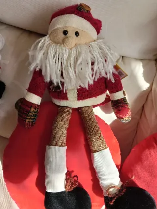 Este muñeco de tela es un detalle encantador para la decoración navideña. Cremallera oxidada y rota. sonido roto. Sólo decorativo - Diseño de Papá Noel. - Detalles en tela de cuadros en brazos y piernas. - Barba y pelo blanco de hilo.