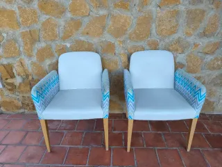 Conjunto de dos butacas con un diseño moderno y llamativo. - Patas de madera. - Brazos con estampado geométrico multicolor. - Muy cómodas y regias. - Precio de las dos juntas.