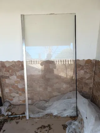 Mampara de ducha con estructura de metal y panel de cristal. Tamaño 195 x 95 cm - Panel de cristal transparente. - Marco de metal plateado. - No se la marca