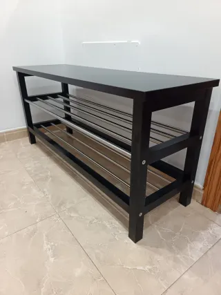 Mueble de entrada con dos niveles para organizar tus zapatos. - Estructura de madera oscura. - Estantes de metal plateado.