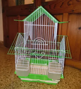 Jaula de estilo casita, ideal para pájaros pequeños. - Estructura de alambre con detalles en verde. - Bandeja inferior extraíble para facilitar la limpieza. - Incluye dos comederos/bebederos.