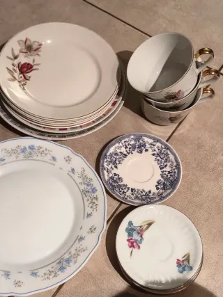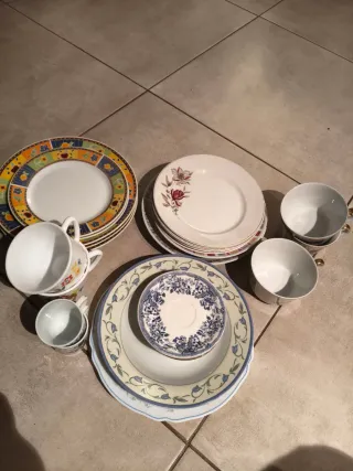 Conjunto de vajilla con un diseño alegre y colorido, perfecto para añadir un toque especial a tus comidas. - Incluye varios platos y tazas. - Diseño floral y geométrico. - Piezas de cerámica y porcelana.