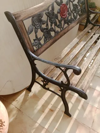 Banco de exterior con un diseño decorativo de rosas. - Estructura de madera y metal. - Detalle de rosas en relieve, una de ellas en color rojo.