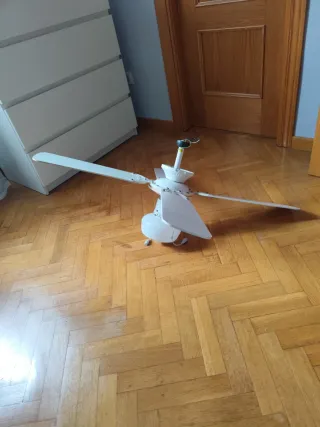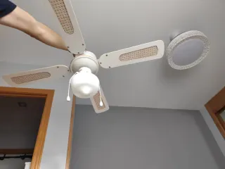 Lámpara ventilador de techo con un diseño moderno y funcional. Combina elementos de metal, plástico y madera para un acabado elegante. - Diseño de 4 aspas. - Iluminación integrada. - Cadena para control de luz y ventilador.