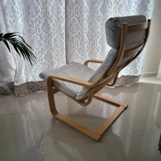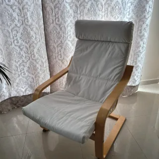 Cómodo sillón Poäng de IKEA, perfecto para relajarse. Su diseño combina una estructura de madera con un tapizado suave en color crema. - Estructura de madera curvada. - Cojín de tela acolchado. - Diseño ergonómico.
