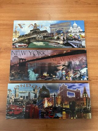 Conjunto de tres cuadros decorativos con motivos de ciudades. - Diseño de París. - Diseño de Nueva York. - Diseño de Londres.