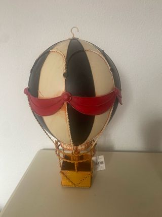 Dos globos decorativos de metal con un diseño encantador. - Uno con franjas blancas y negras y detalles rojos. - Otro con paneles de colores pastel: rosa, verde, azul, morado y amarillo. - Cestas amarillas en la base.