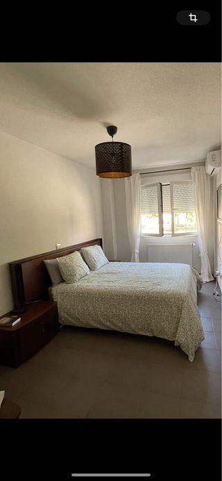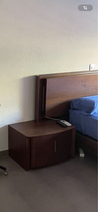 Cama de matrimonio con un diseño elegante. - Estructura de madera robusta. - Cabecero madera. - Incluye somier. De cajón a cajón 3 metros de ancho Alto 1 metro Mesillas de 69cm Largo de la cama con cabecero 2,14