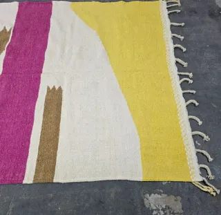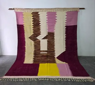Découvrez notre collection de kilims traditionnels, tapis tissés à la main aux élégants motifs géométriques et aux couleurs éclatantes. Ces kilims sont entièrement confectionnés à la main par des artisans qualifiés à Boujad. Contrairement aux tapis à poils longs, les kilims sont légers et réversibles. Ils sont principalement composés de laine et de coton 100 % naturels de haute qualité, teints avec des pigments naturels qui donnent vie aux motifs berbères intemporels et aux lignes audacieuses. Parfait pour les sols, les murs ou même comme jeté de canapé, ce kilim apporte une touche artistique et une couleur vibrante à tout espace.
