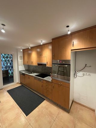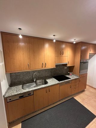 Conjunto de muebles de cocina con acabados en madera y detalles en granito. - Muebles de cocina de madera. - Encimera de granito - Diseño moderno y funcional. - electrodomésticos incluidos (fregadero completo y campana integrada.