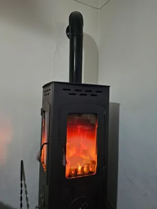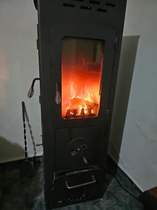 Chimenea de leña con un diseño moderno y funcional. Perfecta para crear un ambiente acogedor. - Estructura principal de metal. - Ventana de cristal para ver el fuego. - Puerta inferior para almacenamiento o cenicero. - no incluye tubos