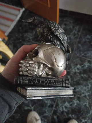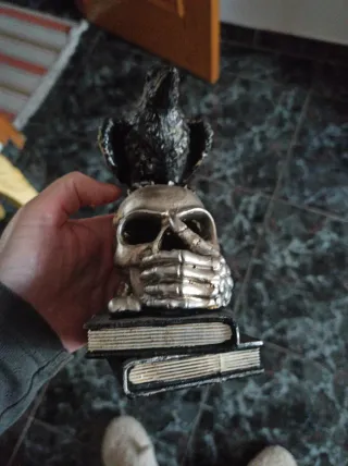 Figura decorativa con un cuervo posado sobre una calavera, que a su vez descansa sobre dos libros.con luz - Diseño detallado. - Acabado plateado y negro.