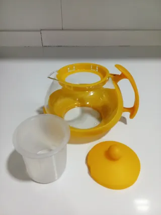 Tetera de cristal y plástico con detalles en color amarillo, ideal para preparar tus infusiones favoritas. - Cuerpo de cristal transparente. - Asa y tapa en color amarillo. - Incluye filtro para infusiones. - Medidas aproximadas de ancho 9cm,de alto 10cm y de profundidad 8,5cm.