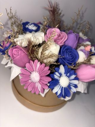 Aura Violeta es un ramo eterno de cera, creado para quienes valoran los detalles que perduran. La combinación de tonos violeta, blanco y rosado transmite calma, elegancia y armonía, convirtiéndolo en una pieza decorativa única que permanece intacta con el tiempo.