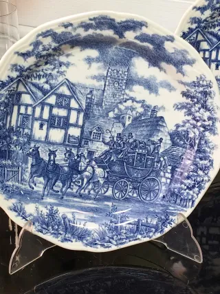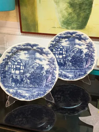 Par de platos decorativos de porcelana con un diseño clásico. - Diámetro de 25 cm. - Motivo de paisaje rural con carruaje y casas.