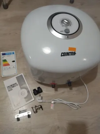 Calentador eléctrico de agua Cointra de 30 litros. Su diseño es moderno y compacto. - Capacidad: 30L - Color: Blanco - Incluye manual de instrucciones y accesorios de montaje. - Etiqueta energética incluida.