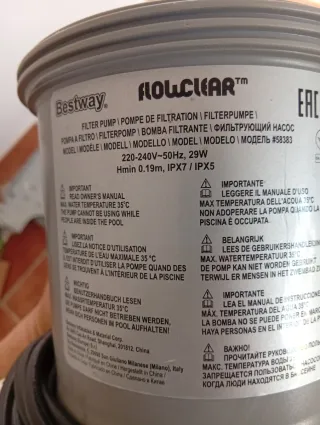 Depuradora para piscinas hinchables de la marca Bestway. - Modelo Flowclear. - Voltaje: 220-240V. - Potencia: 20W. - Protección: IPX7/IPX5.