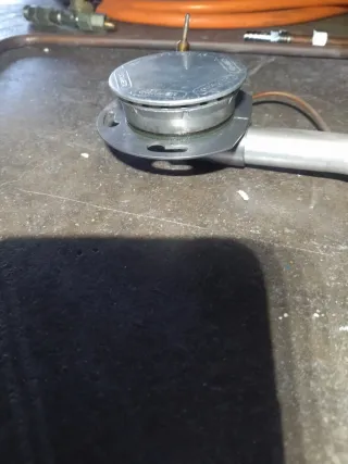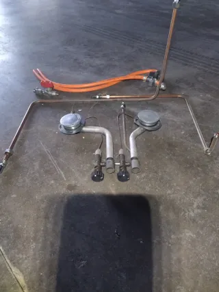 Sistema de calefacción a gas y dos fuegos para cocina de caravana. - Mangueras de gas naranjas. - Válvula de seguridad. - Quemadores plateados.