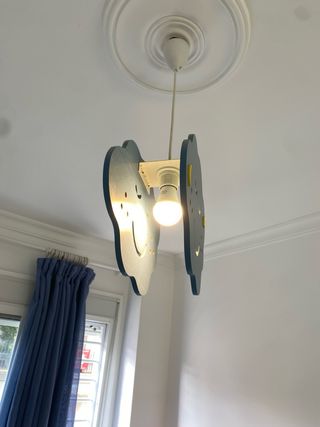 Encantadora lámpara con diseño de nube, luna y estrella. Perfecta para la habitación de los más pequeños. - Fabricada en madera. - Detalles en color azul y amarillo.