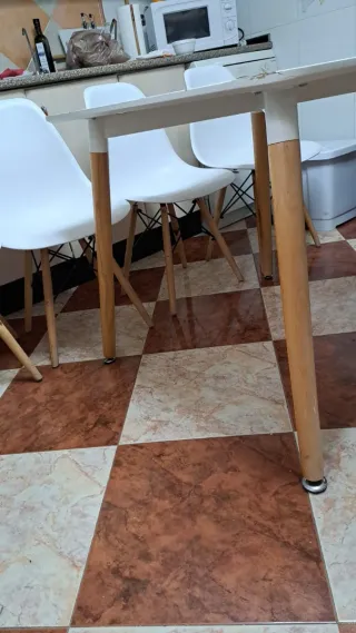 Conjunto de mesa y cuatro sillas para cocina o comedor. - Mesa con superficie lisa. - Sillas de diseño moderno.