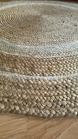 Alfombra redonda tejida con fibras naturales. - Diseño circular con bandas de color. - Textura trenzada. - Aporta un toque rústico y cálido a cualquier espacio. - Sin uso.