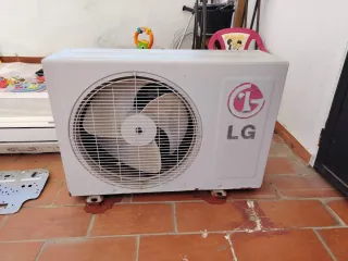 Unidad interior y exterior de aire acondicionado LG. - Unidad interior con rejilla frontal. - Unidad exterior con ventilador visible. - Soporte metálico para montaje. CON CARGA DE GAS RECOGIDA Y MANDO A DISTANCIA