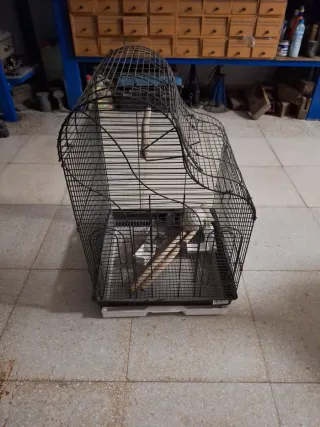 Jaula para pájaros de gran tamaño, ideal para loros o aves similares. Su diseño curvo en la parte superior le da un toque distintivo. - Estructura de alambre resistente. - Bandeja extraíble para facilitar la limpieza. - Incluye perchas de madera.