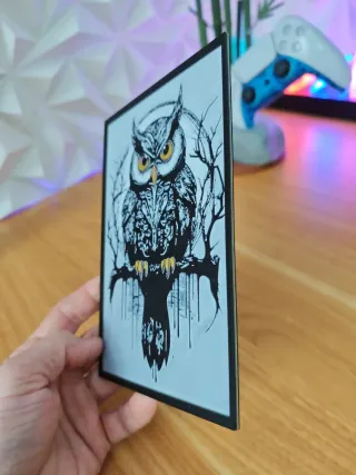Decoración de pared con diseño de búho, ideal para añadir un toque único a tu espacio. Fabricado con impresora 3D - Impresión detallada. - Marco negro.