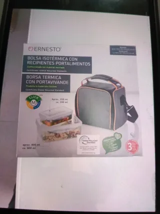 Práctica bolsa térmica ERNESTO con recipientes para llevar tus comidas. - Incluye dos recipientes: uno de 900 ml y otro de 200 ml. - Fabricada con material reciclado. - Certificada Global Recycled Standard.