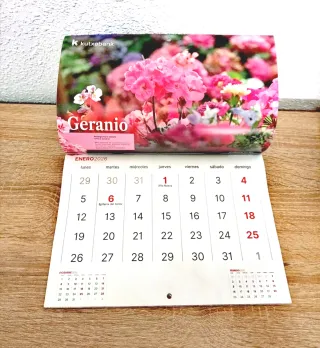 Almanaque del banco Kutxabanc (Banco Cajasur) con flores típicas andaluzas para el año 2026. Es el típico almanaque grande que se cuelga en la pared, ya que tiene un agujero en el centro para esa misma función.