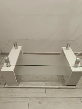 Elegante mesa de centro con superficie de cristal y base de madera. - Diseño moderno y minimalista. - Combina cristal transparente con detalles en blanco. Medidas 1.10 x 60