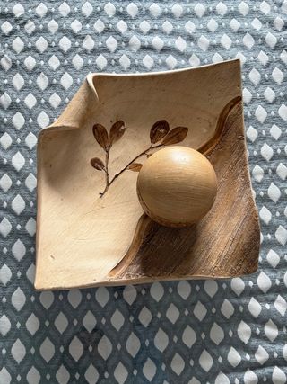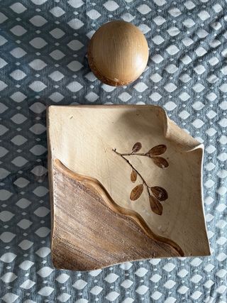 Elegante centro de mesa con un diseño orgánico y texturizado. - Base de cerámica con acabado en tonos beige y marrón. - Detalle decorativo de rama con hojas. - Esfera de madera integrada. - Base mide 30x30 cm - Bola mide 10cm diámetro