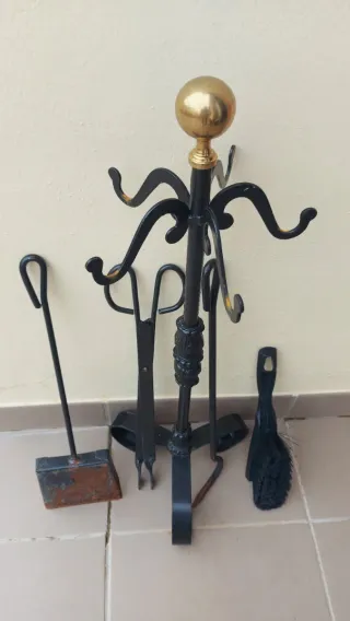 Conjunto de herramientas para chimenea con soporte. - Incluye pala, cepillo, atizador y pinzas. - Acabado en negro con detalles dorados en el pomo. Diseño clásico y elegante. Herramientas para uso en la chimenea, forja, metal, en buen estado. TENAZAS, CEPILLO, GANCHO Y PALA "(que habría que pintarla por que está algo oxidada") CON SOPORTE para dejarlo todo colgado