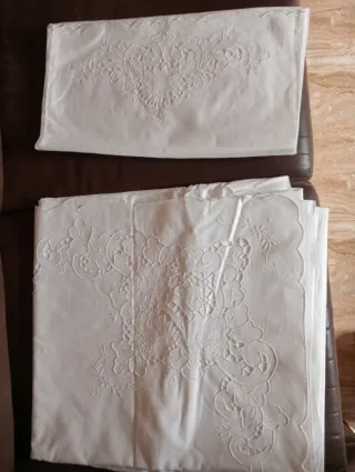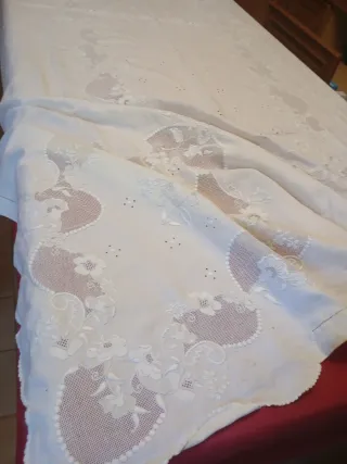 Elegante mantelería de tela con bordado a mano desilado siciliano. - Diseño intrincado y detallado. - Acabado artesanal. - Ideal para ocasiones especiales. Mide 2,70 x 1,60
