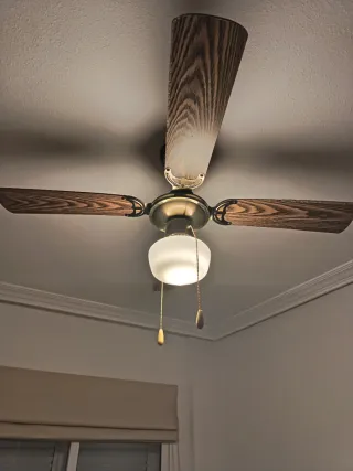 Lámpara ventilador con un diseño elegante que combina madera y detalles metálicos. - Aspas de madera con veta marcada. - Cuerpo central en tono bronce. - Pantalla de cristal opalino.