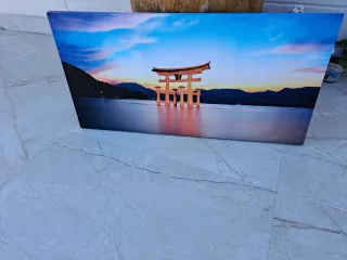 Precioso cuadro decorativo con una escena de un torii en el agua al atardecer. - Tonos azules y rosados vibrantes. - Marco de madera.