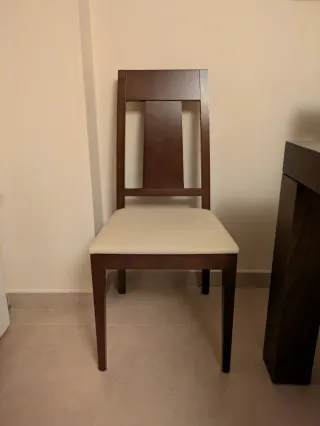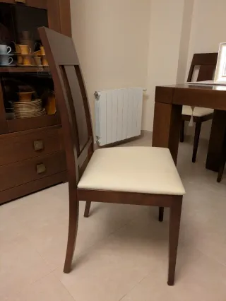 Conjunto de 6 sillas de comedor con un diseño elegante. - Estructura de madera maciza resistente. - Asiento tapizado en polipiel de color beige. - Tanto la estructura de madera como el asiento están impecables, sin ningún roce. - No han tenido apenas uso. - Se vende el conjunto completo.