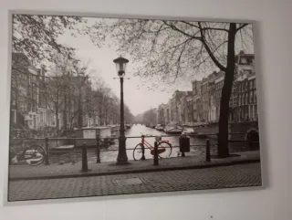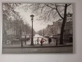Precioso cuadro de gran tamaño con una escena de Amsterdam. Destaca una bicicleta roja en primer plano. - Marco de metal y madera. - Imagen en blanco y negro con detalles en rojo.