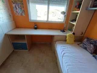 Se vende dormitorio juvenil en buen estado. Incluye 2 camas, estanterías, escritorio, cajones y arcón. - 2 Camasindividuales - Estantería alta con baldas. - Escritorio integrado. - Estilo moderno y funcional. -Colchón de arriba de látex.. Usado y bien conservado. -colchoneta de la cama de abajo poco usada, de muelles. - se regala ropa de cama y mantas